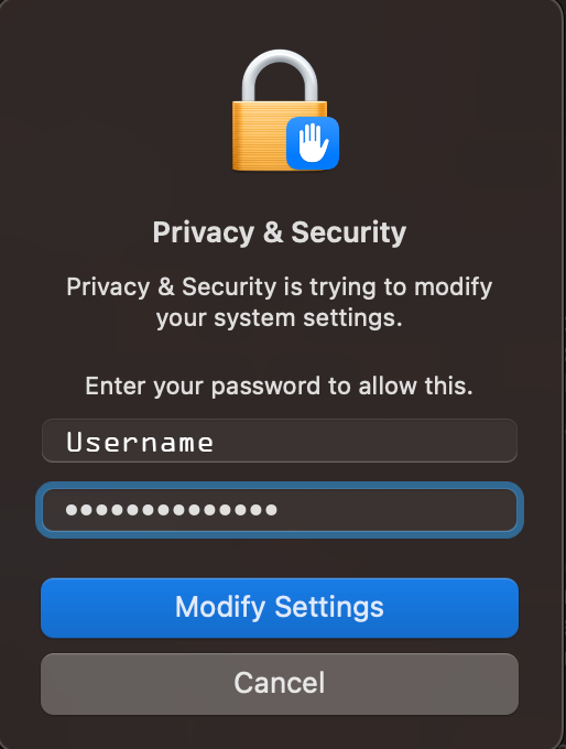 You will now likely be asked for your password to update the settings and then asked a final time to confirm that you want to run the application. After clicking "Open" the application should start.